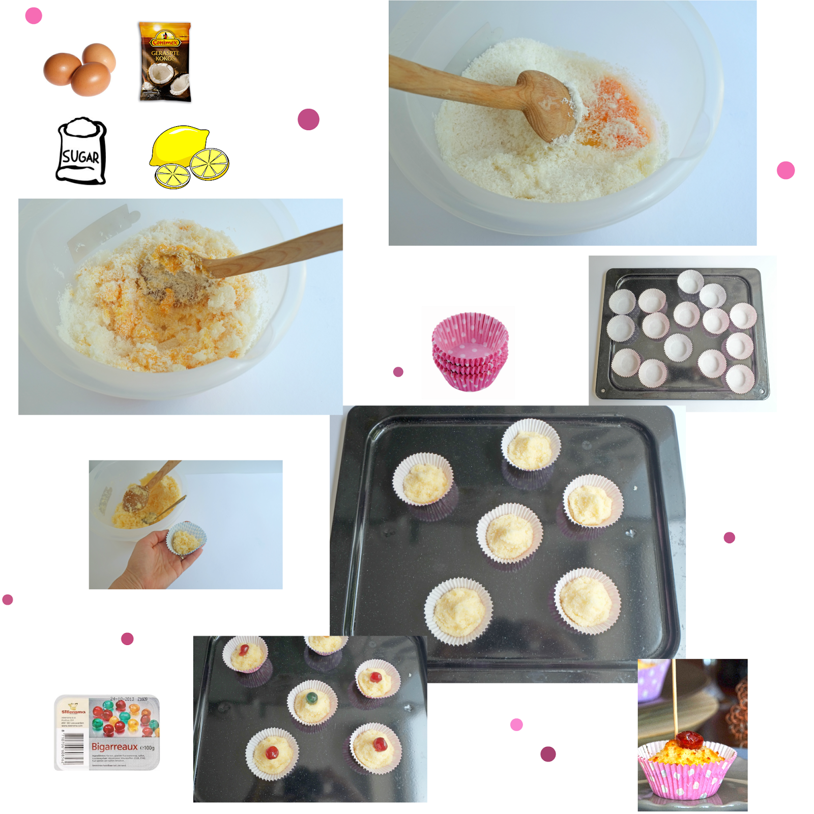 *In een schaal, roer je de suiker, eieren, geraspte kokos en het citroensap tot een zacht mengsel.