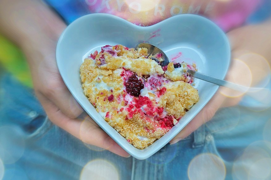 Op een mooie schaal doe je als eerste het mengsel als tweede 6 lepels bosvruchten als derde de gekruimelde koekjes.