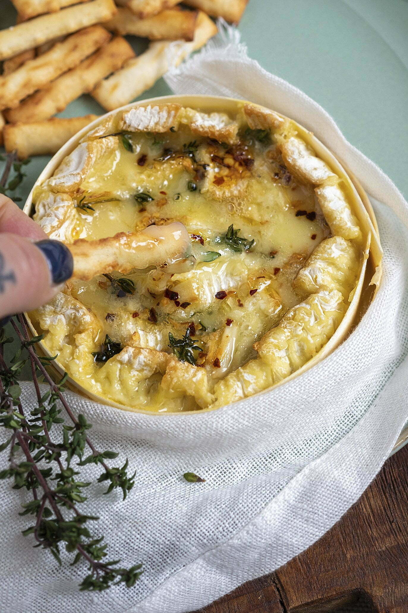 → Strooi nu de chili vlokjes over de camembert.