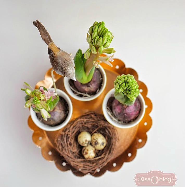 Bloembollen Hyacinten of anders, op een taart plateau met een beetje Voorjaar/Pasen sfeer met een schattig nestje met eieren en een sate stokje (dat ik een beetje afgebroken heb op het einde van het stokje) met een vogeltje.