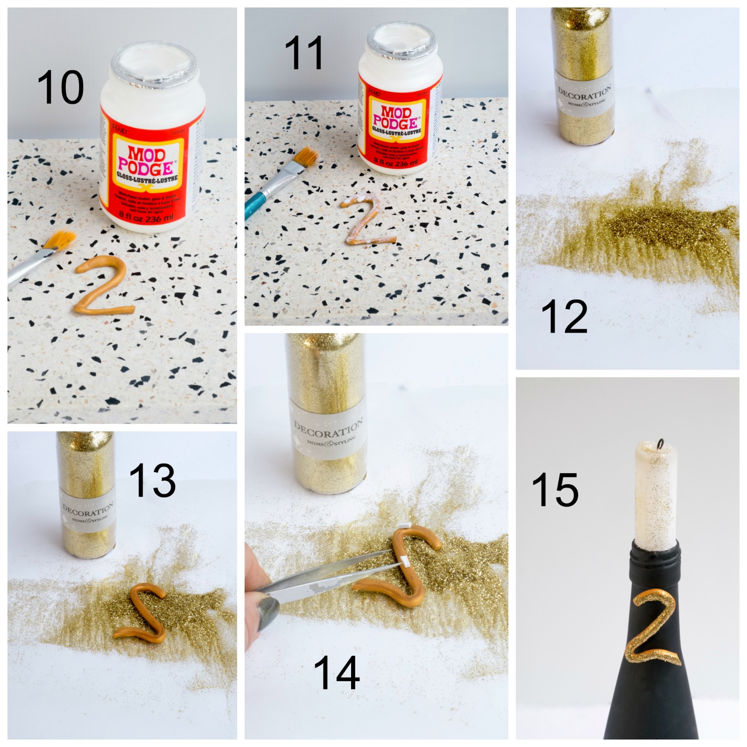 → Als de nummers gebakken zijn, laat even afkoelen en met een kwast breng je Mod Podge aan op elk getal.