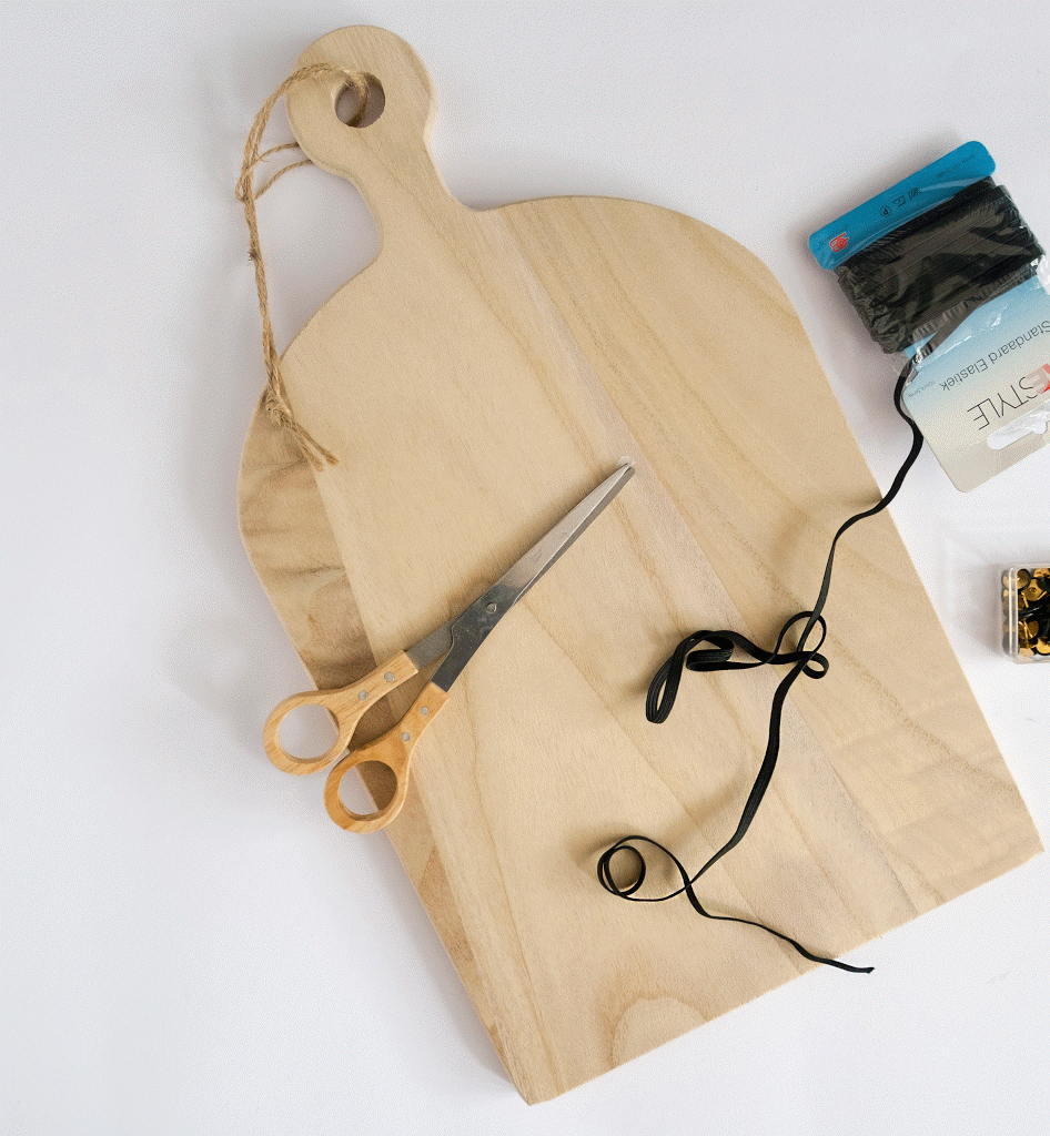 →Knip 3 stukjes elastiek of meer. maak vast met de punaise op de achterkant van de houten plank.