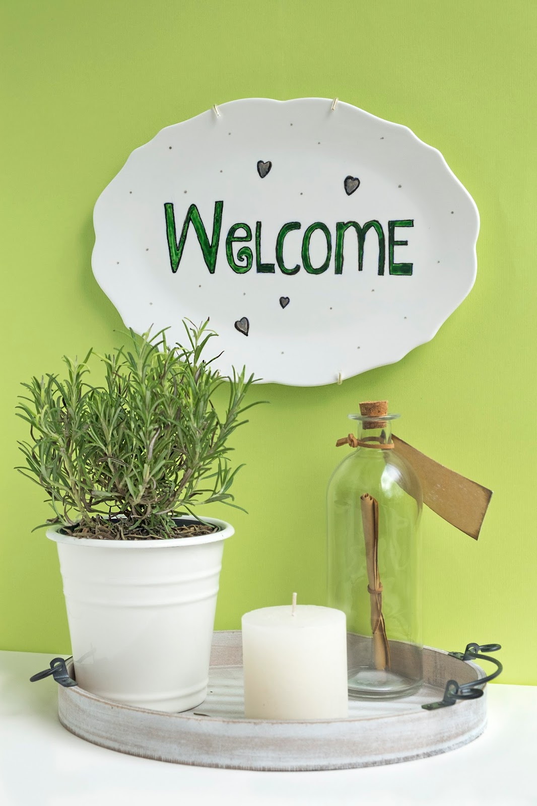 Met een zwarte porseleinen pen teken je de Welcome tekst en hartjes.