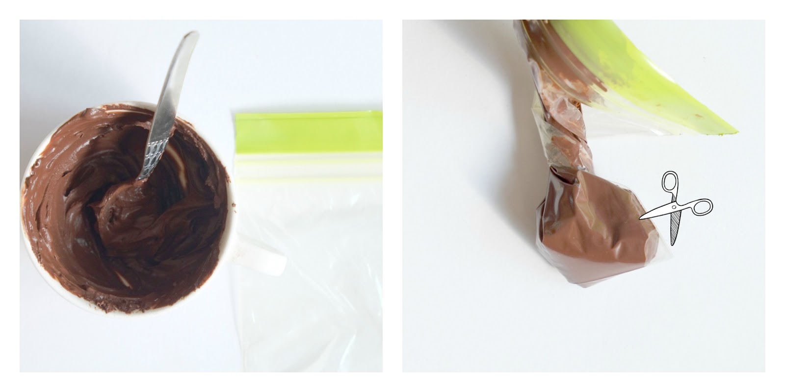 *Met een plastic zakje kun je in de chocoladeglazuur, hele dunne lijntjes maken.