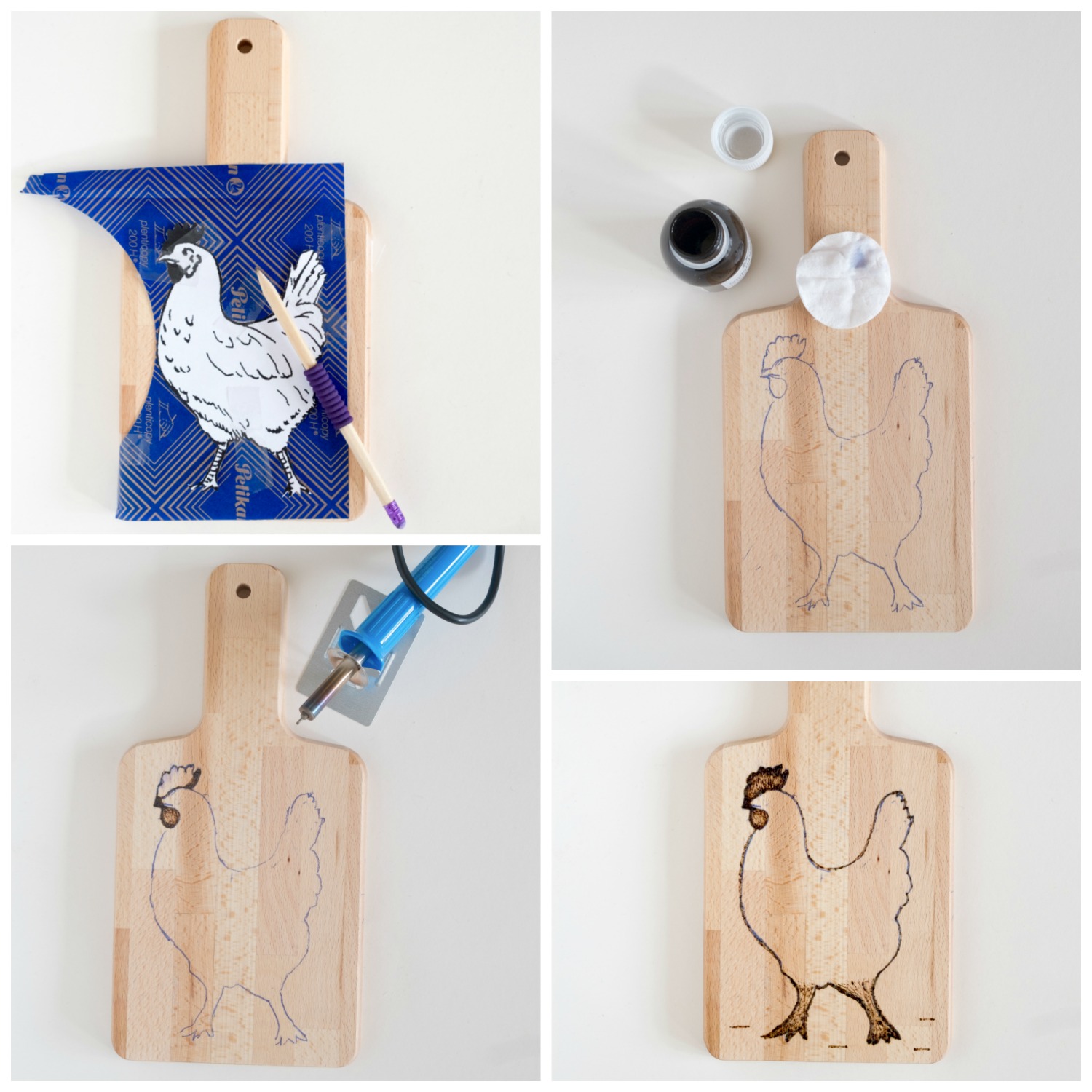 De houtbrander aanzetten, en als het kopje echt heet is mag je beginnen met de kip na te tekenen.