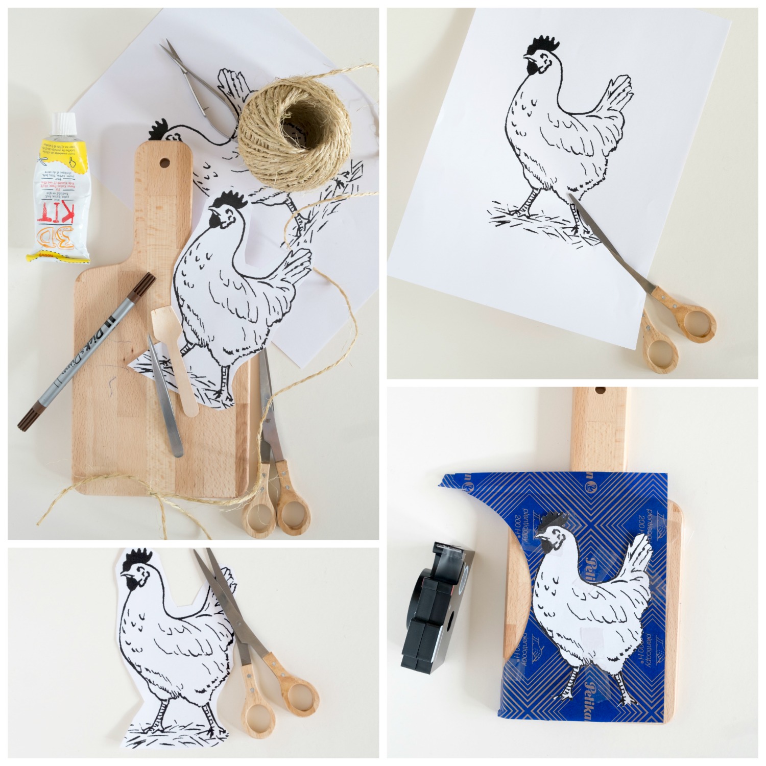 Met een pen of potlood teken je de kip op het stukpapier, zodat op die manier de getekende kip op het kaasplankje komt te staan.