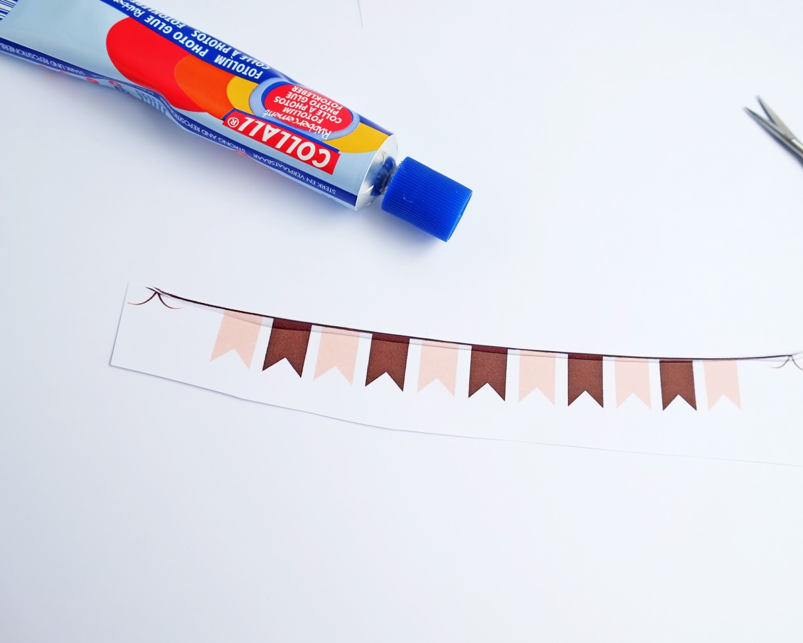 *Breng op de lijn van de vlaggetjes de fotolijm aan.