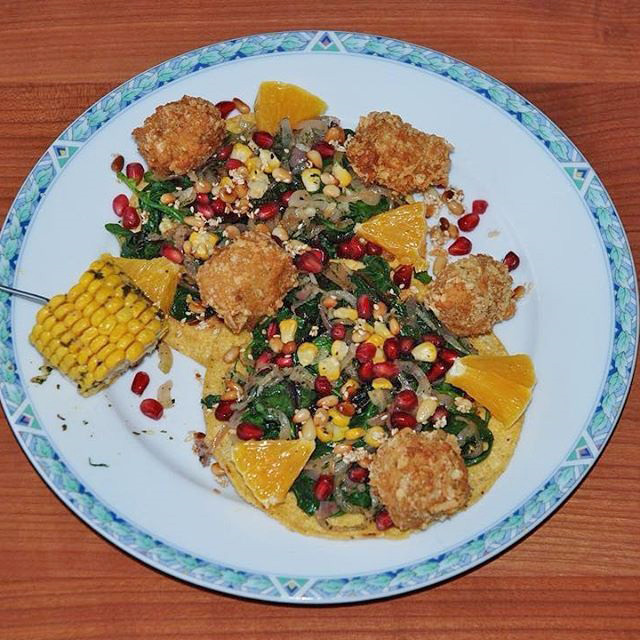 De zalm en het fruit tillen de zuurkool als groente naar een hoger plan en de zalm vormt een jasje om de groente. Niet iedereen houdt echter van zuurkool en ik kan slecht kiezen. Dus wil ik ook graag mijn Maïstortilla met bladgroenten, fruit en Boer’n Trots Klaver Pikant noemen. Daarin verwerk ik granaatappelpietjes en sinaasappel.