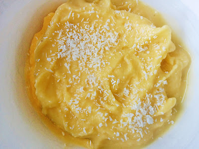 Afhankelijk van hoe goed je keukenmachine is kan je direct aan de slag of wacht je heel even tot de mango een klein beetje is ontdooid. Zodra je aan de slag kan druk je op starten. Je wacht tot de substantie geen stukjes meer bevat. Indien nodig kan je extra kokosmelk of water toevoegen. Schep in een schaaltje en versier eventueel met kokosrasp of rozijnen.