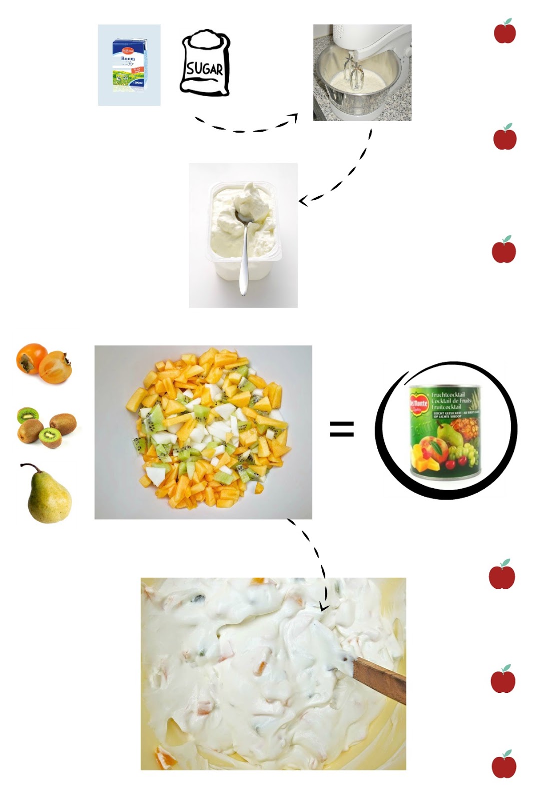 *Het fruit uit laten lekken en dan door de slagroom en kwark mengen.