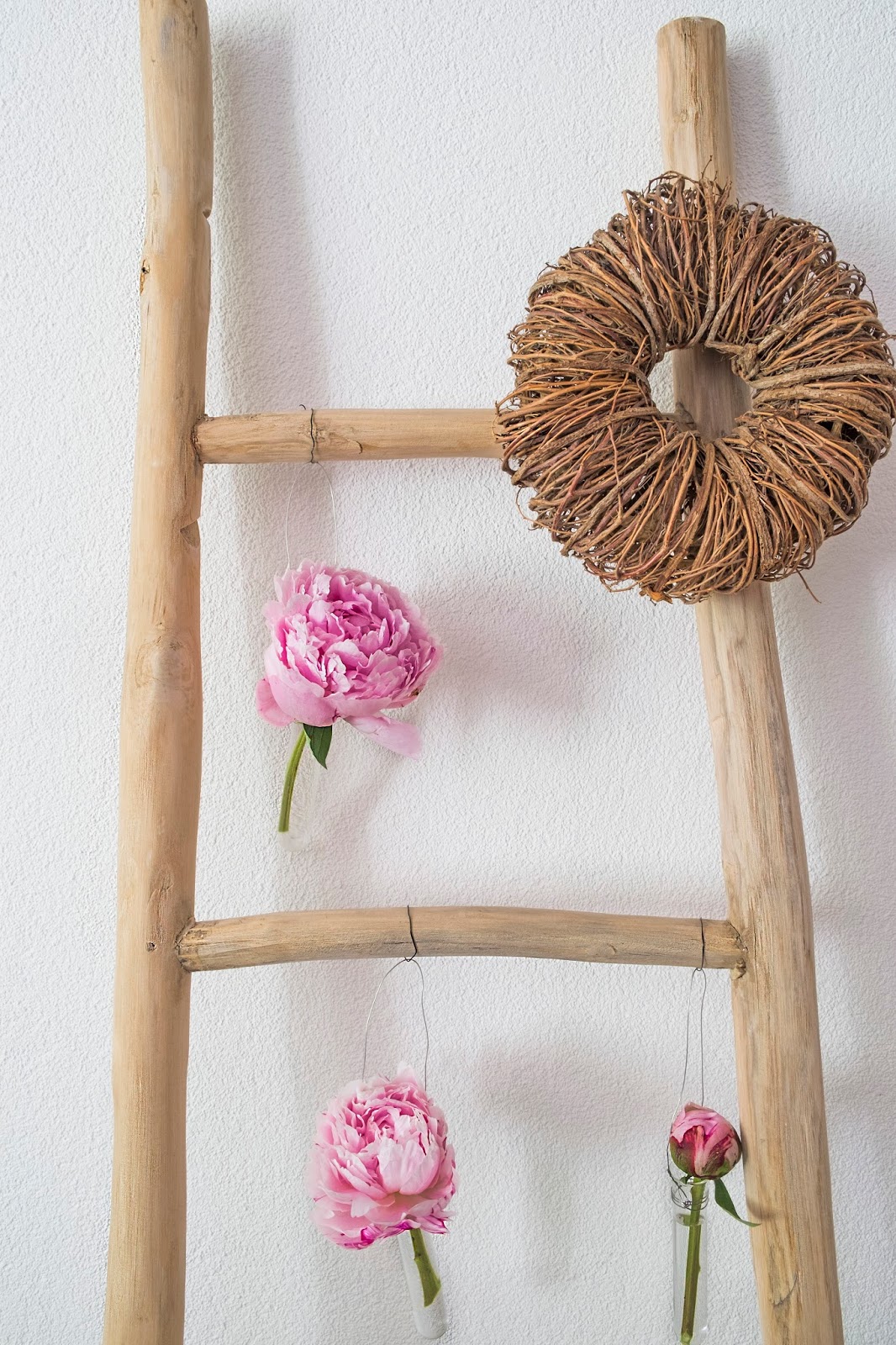 Verse bloemen in huis brengen sfeer en staan overal mooi. Ik ben zo enthousiast dat ik een houten trap heb gekocht en een paar glazen tubes om op te kunnen hangen en verse bloemen er in te doen. Dit interieur idee is heel eenvoudig maar mooi!