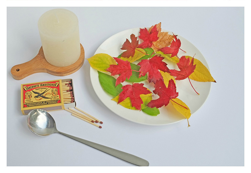 Daarna druk je met de warme lepel (5 sec.) de kleine bladeren in de roomkleur kaars.