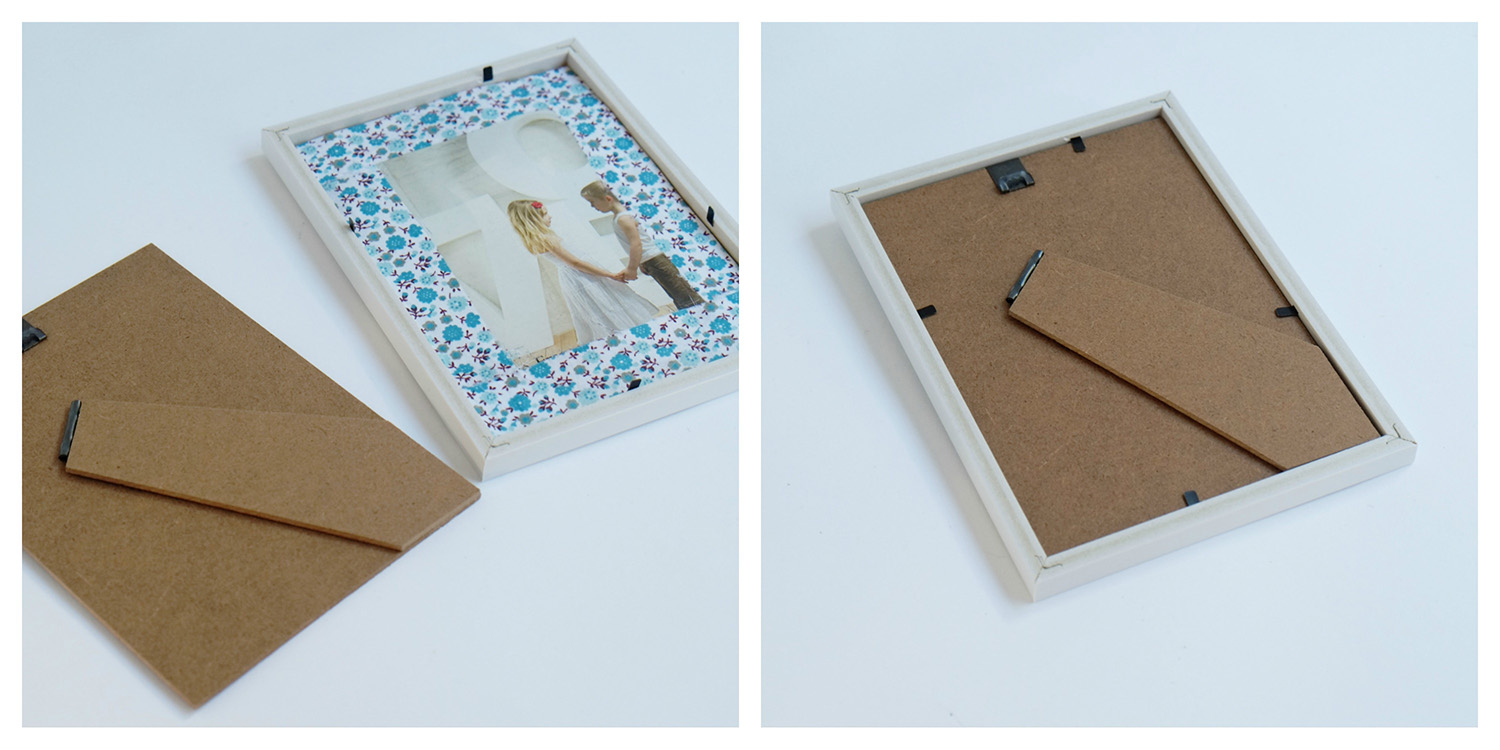 →Nu de achterkant van de lijst in de lijst met het gestoffeerde karton met het bestek. En klaar!