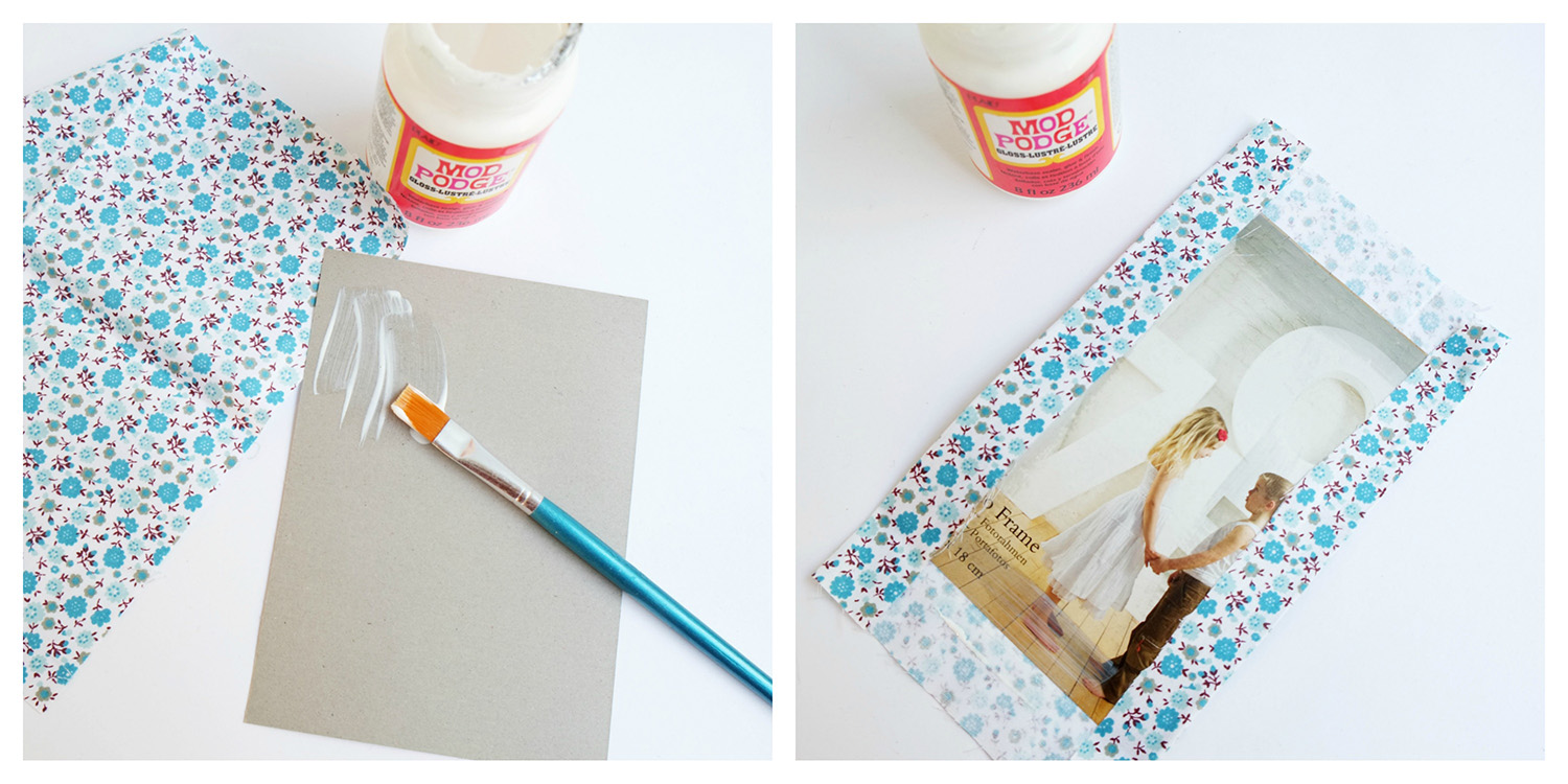 →Breng met een kwast de Mod Podge op het karton van de lijst aan en vervolgens vouw het restant van de stof om aan de achterkant en plak vast.