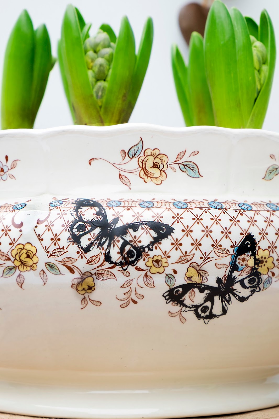 Ik heb een grote schaal en een bijpassende melkkan met Hyacinten er in, super leuk voor op de salon tafel of kastje.