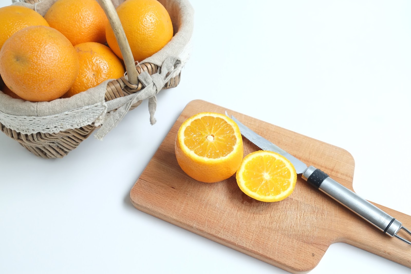 *Knijp het vruchtvlees van de sinaasappels door een zeef heen en het sap dat er uitkomt opvangen en apart zetten.