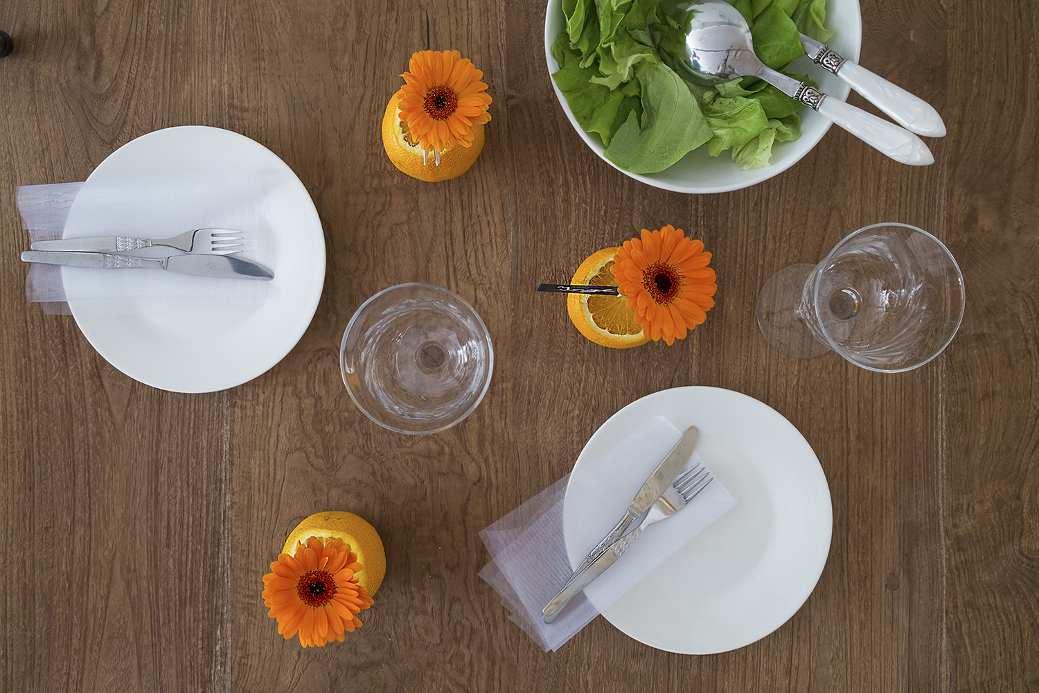 Je kunt heel makkelijk jouw tafel decoreren met mooie bloemen en sinaasappels.