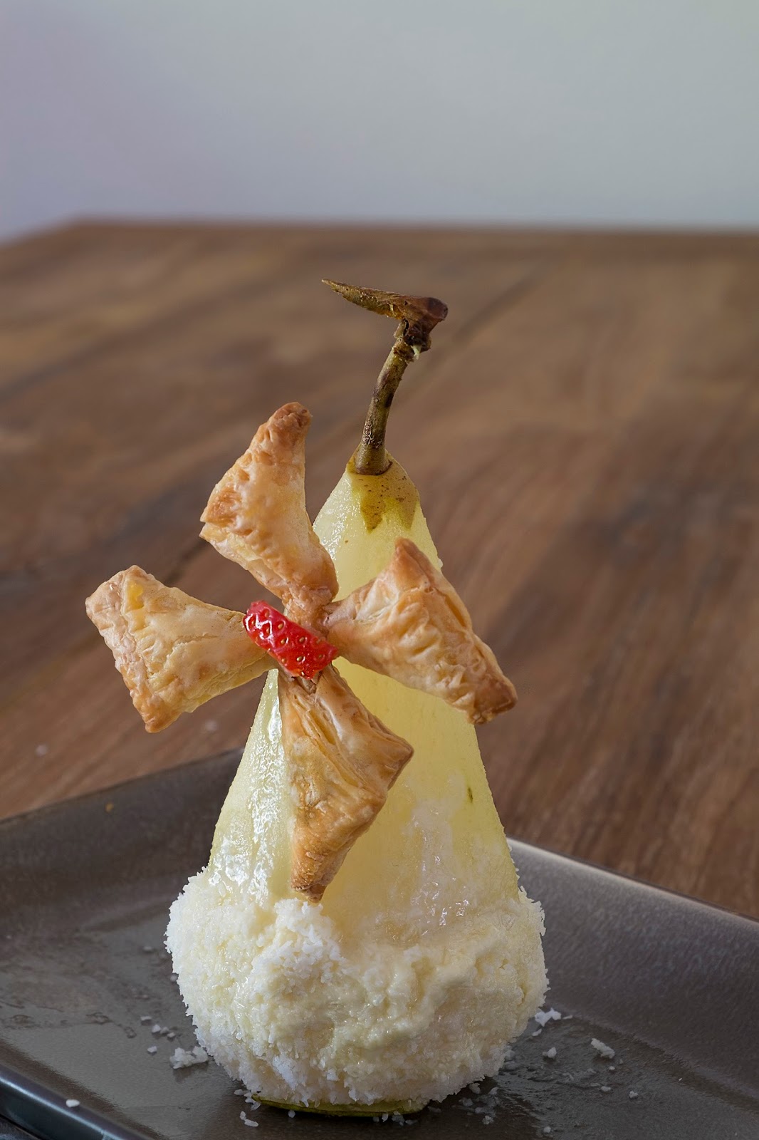 Deze traktatie, windmolen is ook een mooie en lekkere presentatie als dessert of nagerecht met een bolletje ijs erbij. Het is een gekookte peer, half bedekt met witte chocolade en kokos.
