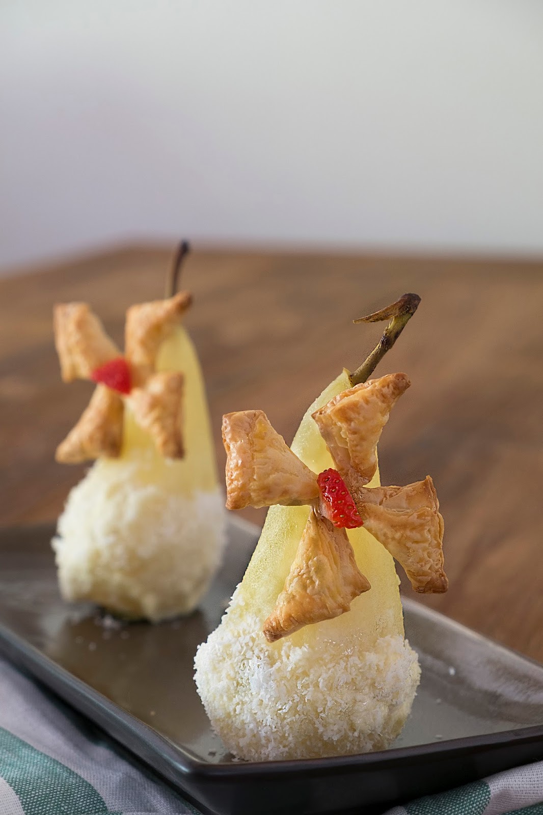 Breek een kwart van de tandstoker af en steek op de peer met het bladerdeeg windmolentje.