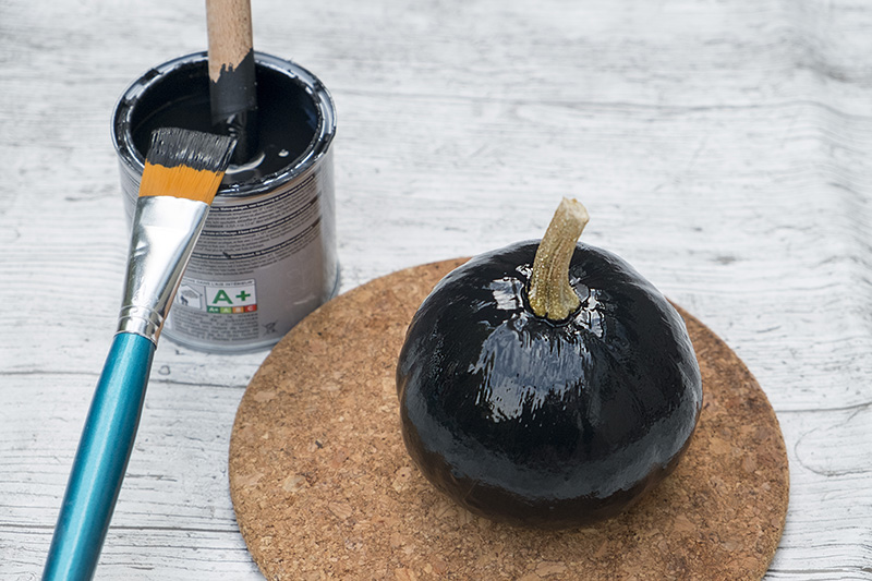→Met een kwast beschilder je de hele pompoen. Twee keer is genoeg.
